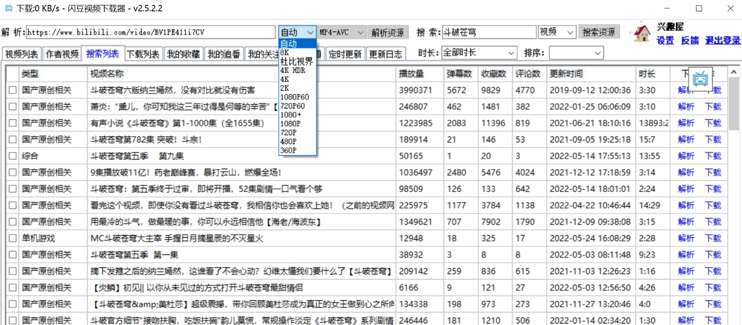 5、可以通过关键词进行相关资源搜索,搜索列表呈现 资源类型、视频名称、播放量、弹幕数、收藏数、评论数、更新时间、时长 及 下载操作;