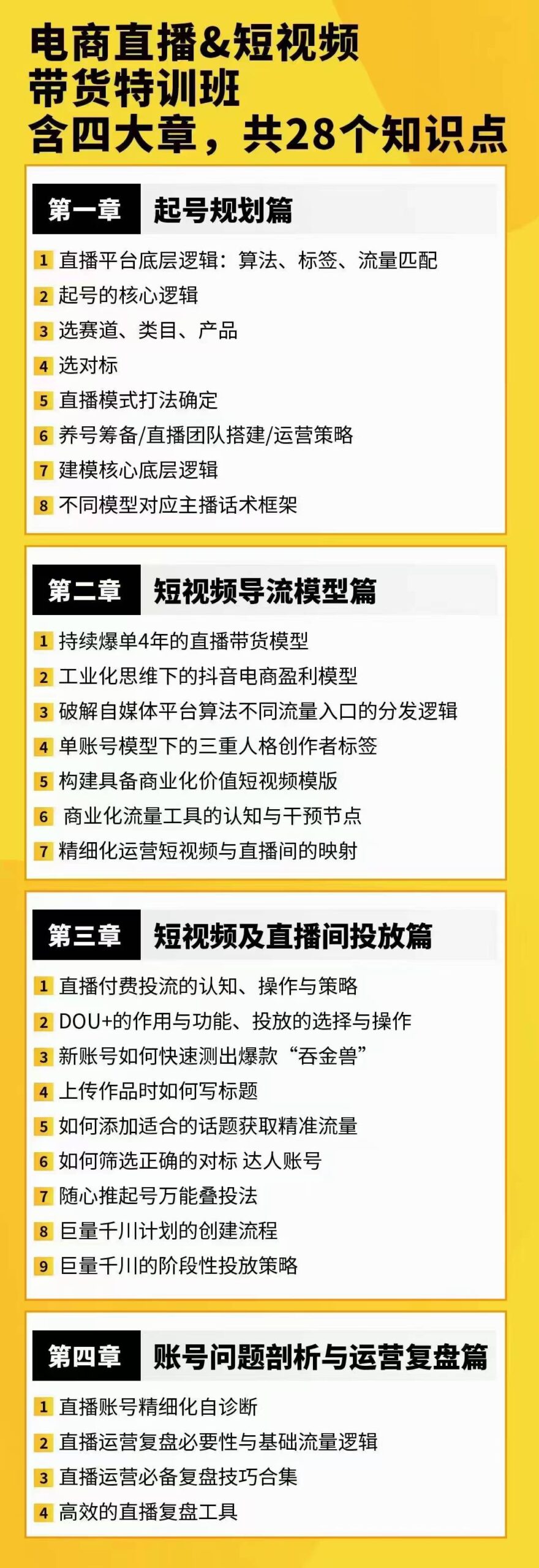 直播带货模型落地课 2025-01-31 推广 页面示例 成为会员可免费学习该课程 课程介绍 一群宝宝·抖音直播&短视频带货特训班,从0-1再到第一,四大章节28个知识点 直播带货模型落地课 课程目录 第二课:新手小白如何正确起号 第三课:主播话术篇 第四课:短视频爆量计划和千川投放 第四课:短视频锤爆直播间 第五课:自我诊断和复盘 第一课: 直播起号逻辑和起号前准备(本) 学习必看 给力项目,网站VIP会员免费下载 资源下载下载价格VIP专享仅限VIP下载升级VIP立即购买 页面示例 成为会员可免费学习该课程